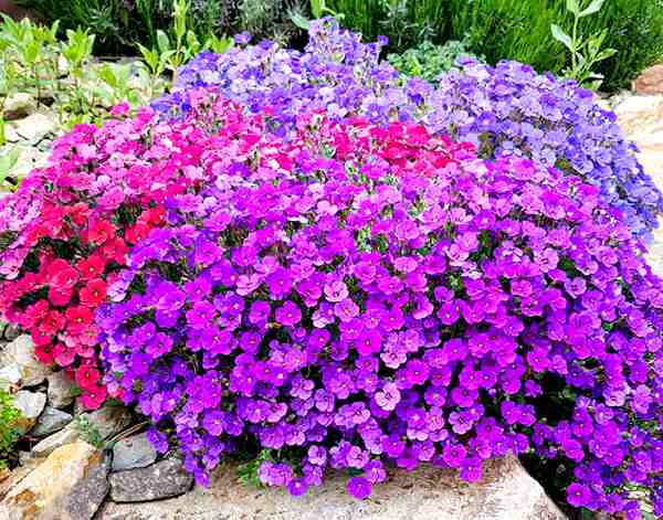 Семена аубреции идеально подходят для создания в саду красочного коврового покрытия. Невысокие растения плотно покрывают поверхность земли стелющимися побегами, на которых появляются многочисленные кисти, собранные из мелких цветков различной окраски: