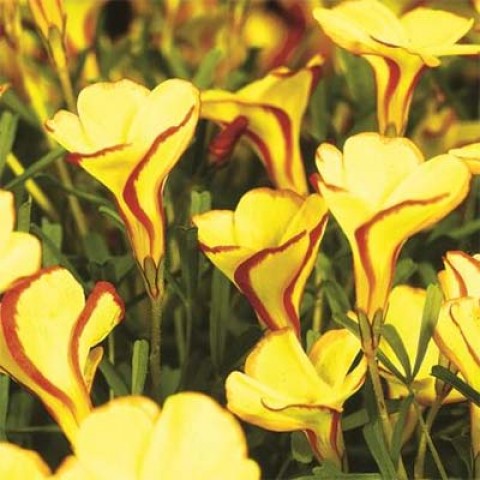 Луковицы кислицы пестроцветной Голден Капе (Oxalis Versicolor, Golden Cape) высаживают в дренированную влажную почву на солнце или в полутени. Благодаря компактным размерам и небольшой высоте (до 30 сантиметров) декоративная культура найдет свое место в саду. Ее часто можно встретить у водоемов, на газонах, миксбордерах, цветниках. Листва тонкая, как палочки, ярко-зеленая. Цветы в форме граммофона. Впечатляет их яркий окрас — насыщенно-желтый с красной каймой. В закрытом бутоне полоска расположена по спирали — получается эффектно. Многолетник ценится за высокую декоративность, морозостойкость.