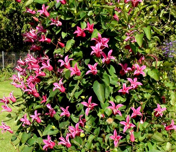 Саженцы клематиса гибридного Хэппи Диана (Happy Diana) предпочитают защищённые и хорошо освещенные участки с плодородной почвой. Цветки диаметром 4-7 см, по форме напоминают лилиецетные тюльпаны, темно-розовые. Цветет обильно и продолжительно с июня по сентябрь. Клематис гибридный Хэппи Диана (Happy Diana) благодаря листовым хвостикам способен лазать на высоту до 400 см, рекомендуется высаживать возле беседок, арок, вдоль ограждений и других садовых конструкций. Подходит как для групповых посадок, так и для отдельно стоящей шпалеры.