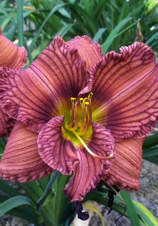 • Окраска цветка : светло-коричневый с жёлто-зелёным горлом и фиолетовыми прожилками