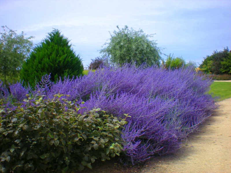 Саженцы перовскии лебедолистной Blue Spire высаживать предпочтительнее на солнечное место. Но растение хорошо выносит легкую полутень. Правда в этом случае оно вытягивается и нуждается в подвязке. Листья серебристо-серые, до 5 см длиной и 2,5 см шириной. От стеблей и листвы исходит острый аромат, если их разломать или растереть. Высота кустарника варьируется от 90 до 150 см. В конце лета и осенью на перовскии лебедолистной Blue Spire появляются соцветия до 30 см длиной, которые состоят из маленьких, трубчатых цветов похожих на лаванду. Цветение продолжается в течение двух или трех месяцев.